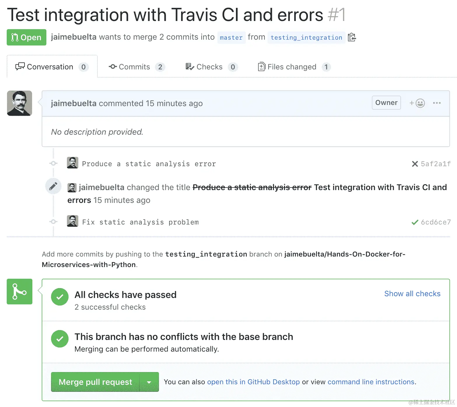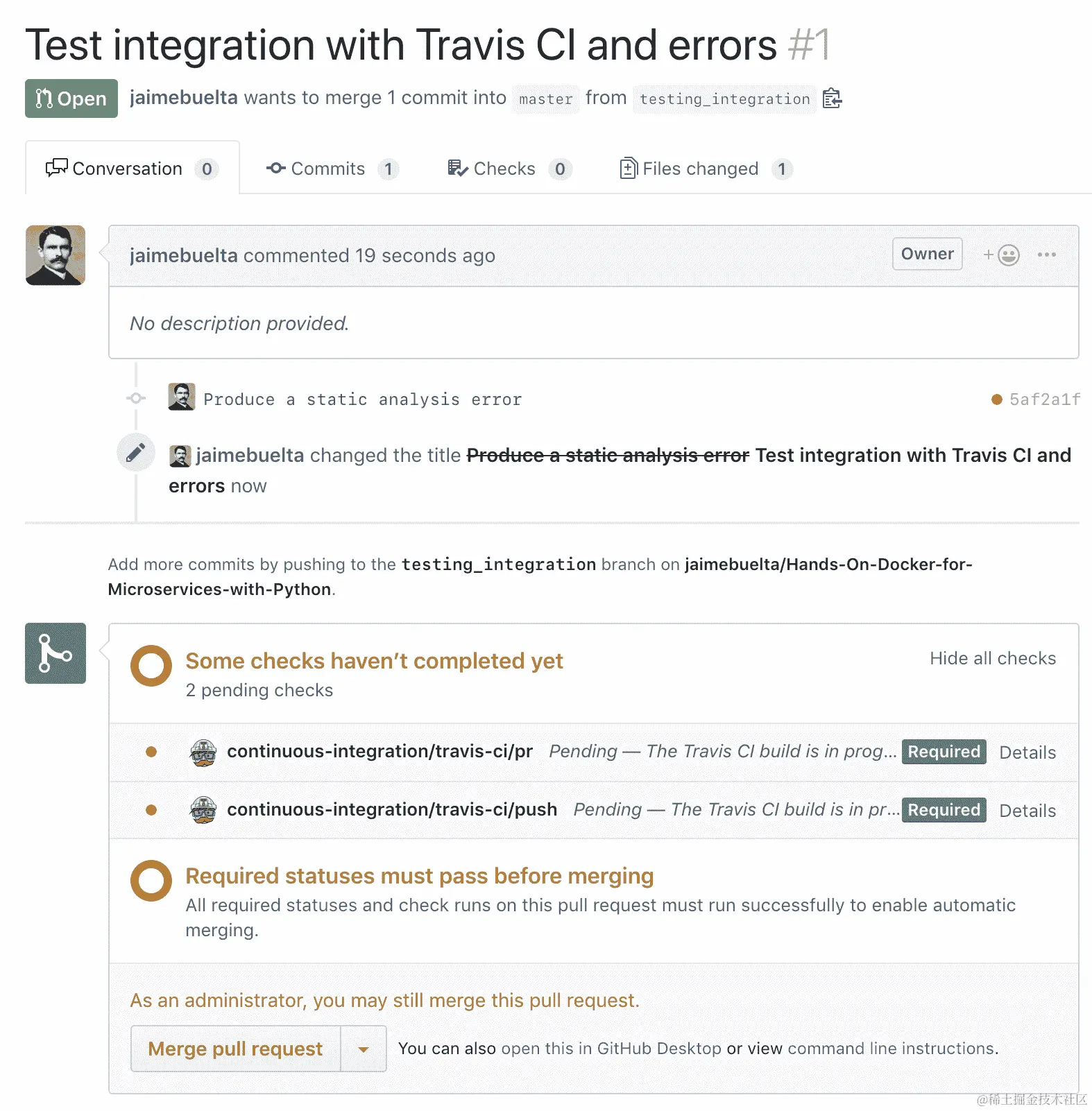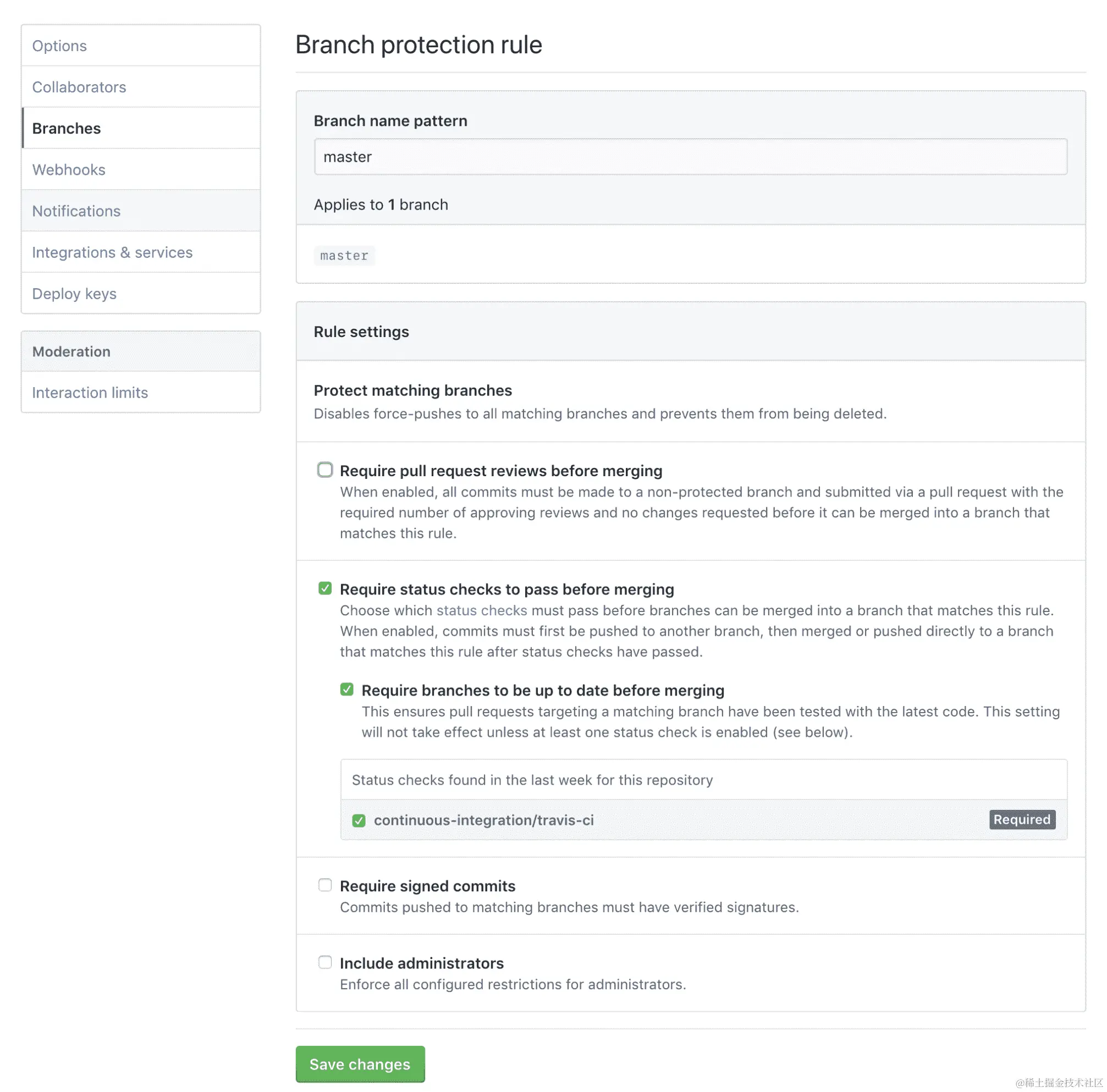 GitHub 有一个模型:拉取请求。我们将配置拉取请求自动检查构建是否通过并避免合并。如果我们强制任何功能分支在合并回来之前也与主分支保持最新,那么主分支最终会非常稳定。