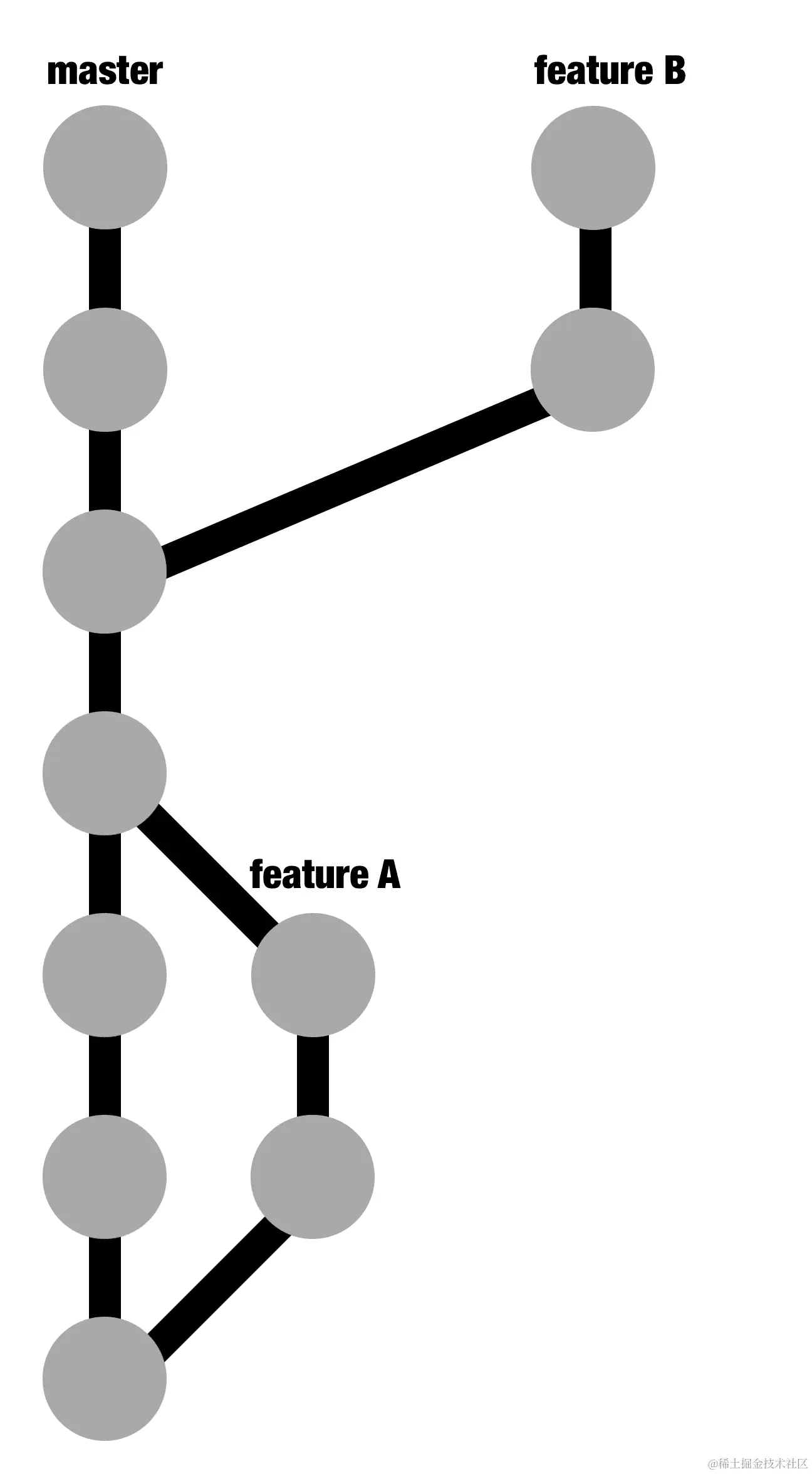 在这个例子中,我们看到主分支(master)分支到开发feature A。Feature A随后被简要介绍。还有一个feature B,因为它还没有准备好,所以尚未合并。有了额外的信息,我们可以知道何时安全地将一个功能分支合并到主分支中:
