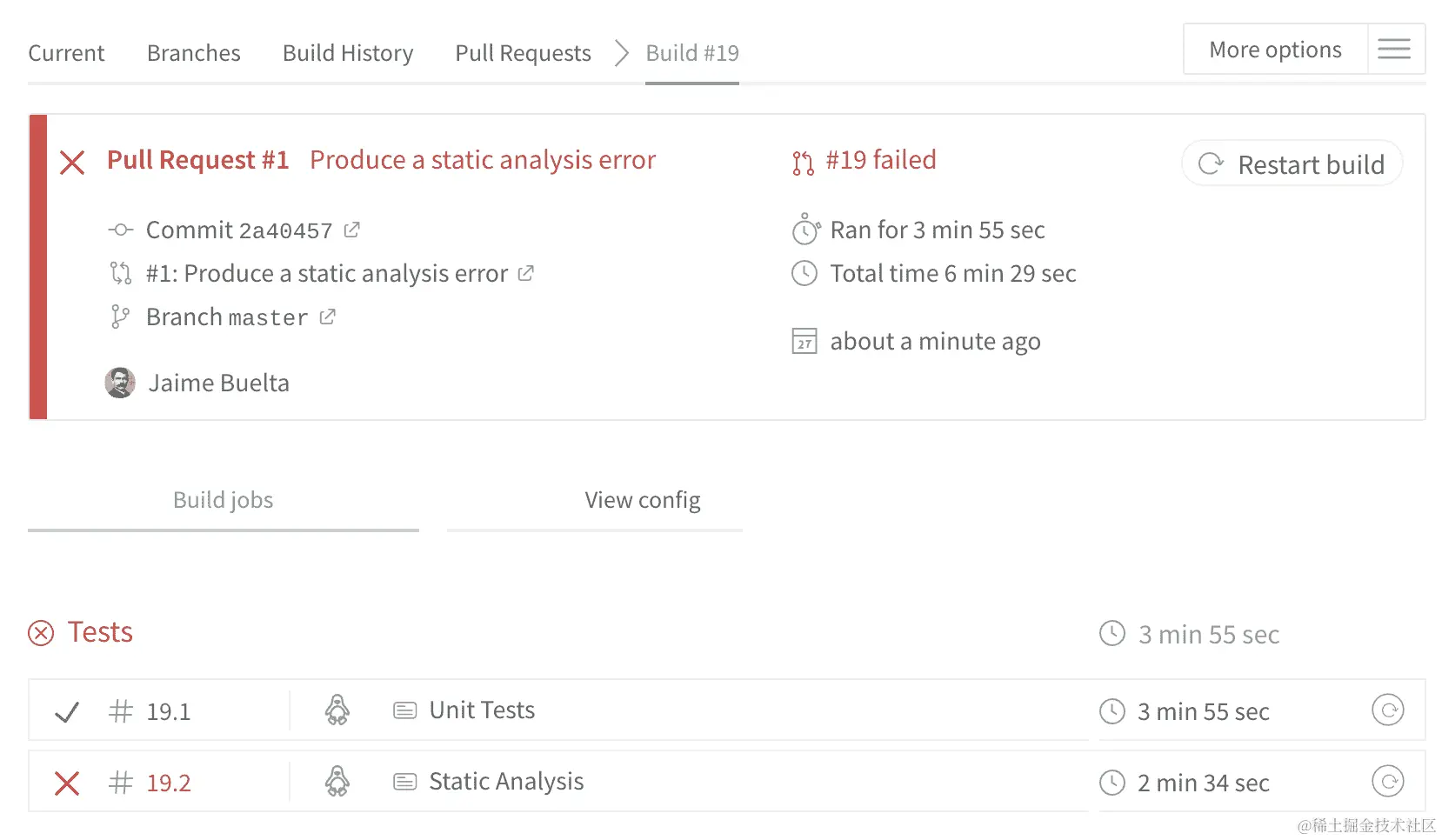 描述构建错误的一种常见方式是说构建已损坏。构建可以以不同的方式中断,某些类型的错误可能会在早期停止它(例如在运行测试之前的编译错误),或者我们可以继续检测更多问题(例如运行所有测试以返回所有可能的错误)。