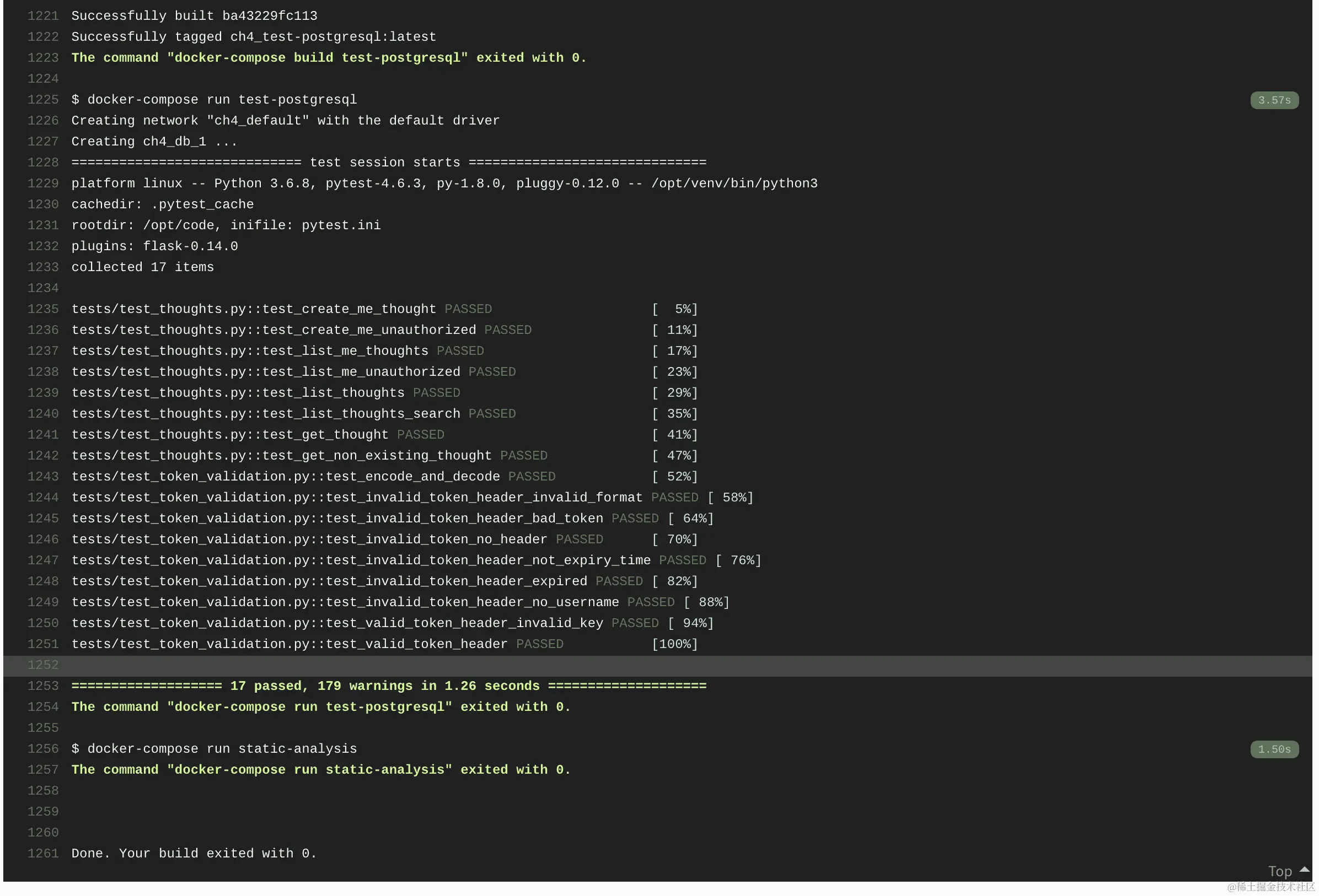 请注意,我们同时构建数据库和测试图像。下一个阶段构建其余的元素,这些元素已经在缓存中可用,因此速度会非常快。测试和静态分析都可以在两个不同的容器中并行运行。