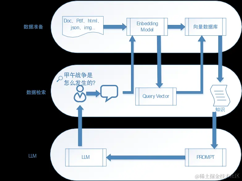 问答推理框架:问答推理框架主要用来实现 RAG 系统的问答逻辑。它接收用户的提问输入,并根据输入向向量数据库发起索引请求,将得到的索引结果与问题结合,形成新的提示词(prompt),并将提示词提交给 LLM,最后将 LLM 生成的结果返回给用户。这里我们将采用 LlamaIndex 工具来实现这个框架。其主要由 3 部分组成:- 数据连接。首先将数据能读取进来,这样才能挖掘。