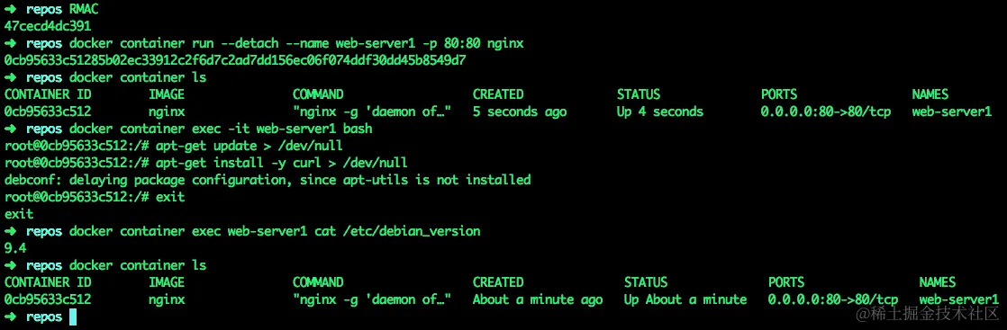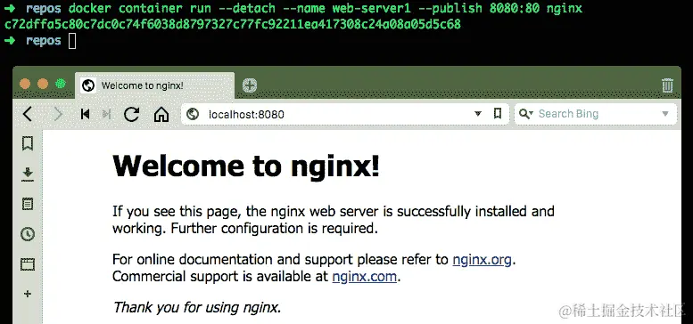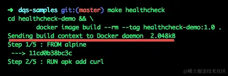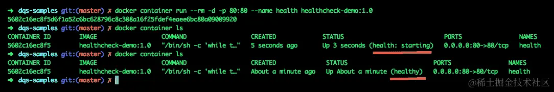 您可以看到HEALTHCHECK最初报告状态为starting,但一旦HEALTHCHECK CMD报告成功,状态就会更新为healthy。