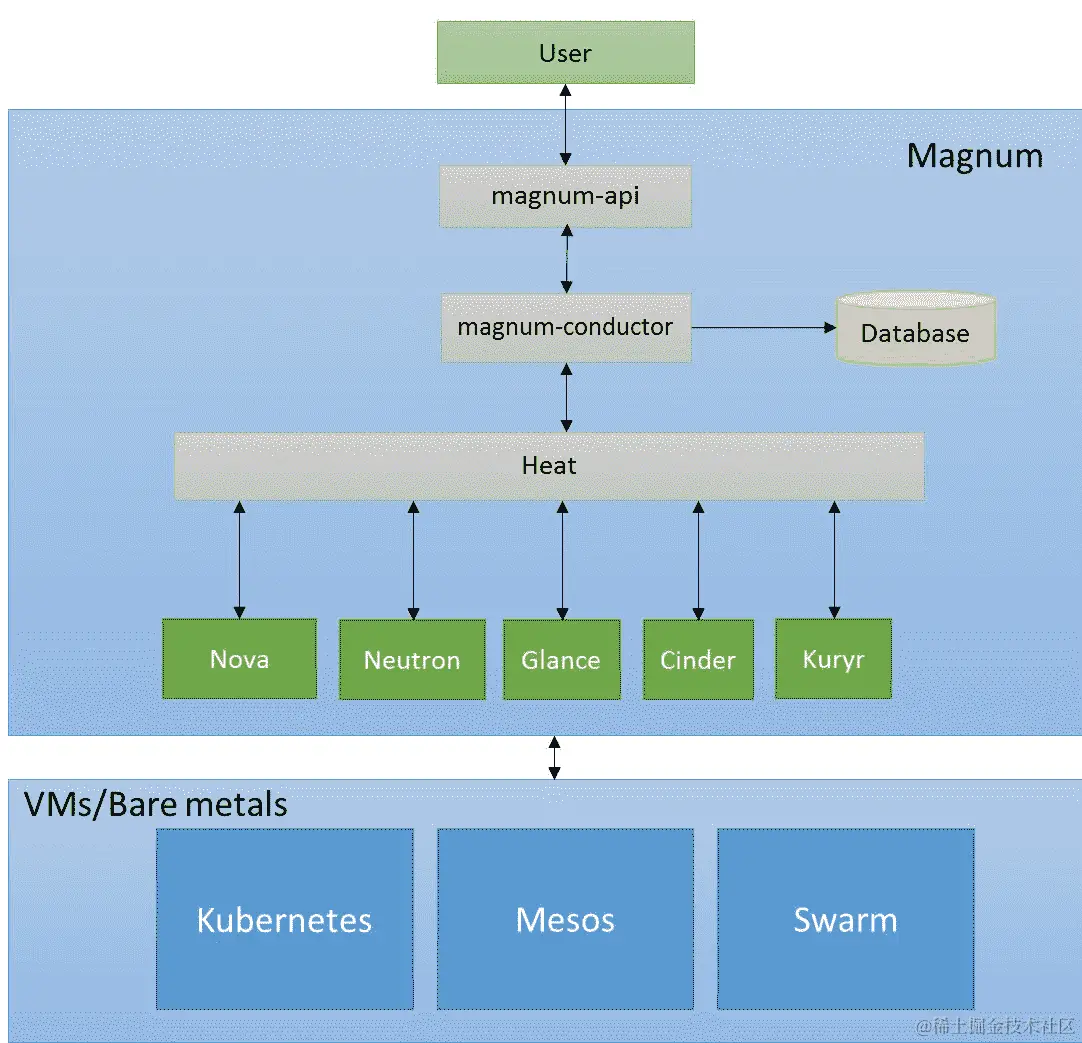 Magnum conductor 是为 Magnum 提供协调和数据库查询支持的 RPC 服务器。它是无状态的和水平可扩展的,这意味着可以同时运行多个 conductor 服务实例。magnum-conductor服务选择集群驱动程序,然后将模板文件发送到 Heat 服务进行安装,并最终更新数据库以获取对象详细信息。