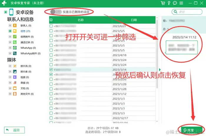 步骤3:等扫描结束后,就可以点击搜索框输入关键词查找需要恢复的短信啦,也可以打开页面上方的【仅显示已删除项目】的开关,加速筛查。最后点击 【恢复】 键将短信恢复到手机里。