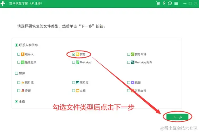 步骤2:连接完成之后,我们需要在电脑上选择文件类型,即需要恢复的 【信息】 ,精确选择文件类型可以缩短扫描设备数据的时间。选择完成后点击下一步。