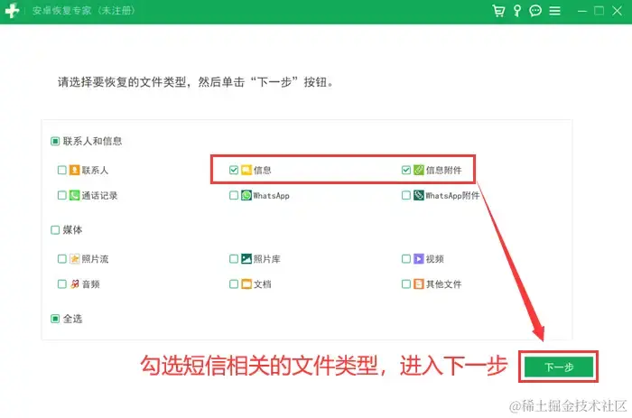 第二步:连接完成后在电脑上选择与手机短信相关的文件类型,例如 【信息】和【信息附件】 ,选择完成后点击下一步,软件就会扫描设备数据啦!