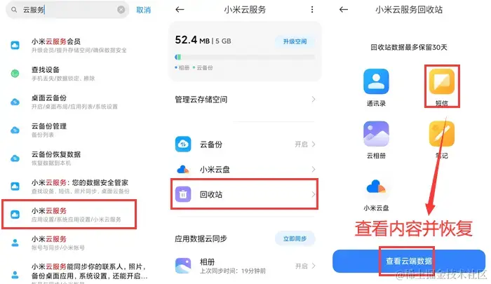 第二步:在云服务中找到 【回收站】 ,进入选择 【短信】 即可查看备份过的短信内容并且恢复到手机。