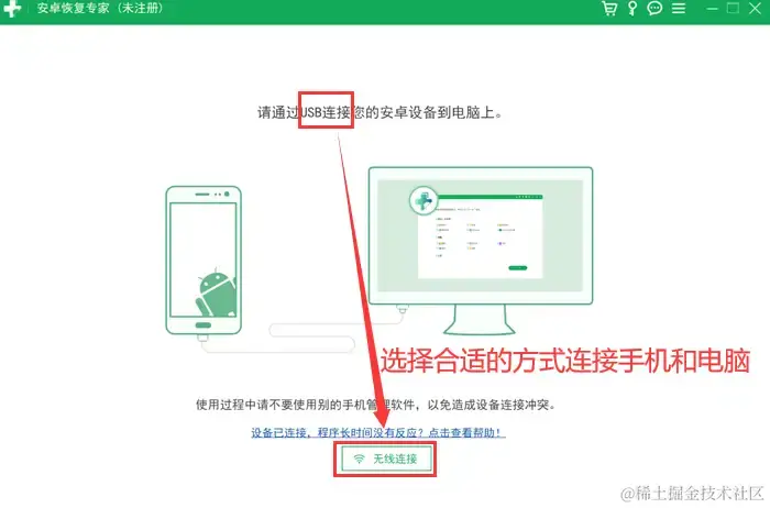 第一步:安装完成后,按照提示选择合适的方式连接手机和电脑。这里小编使用的是USB有线连接,接收更快更稳定!