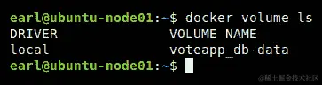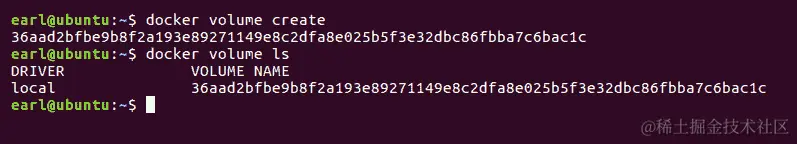 执行上述命令将创建一个新的 Docker 卷并分配一个随机名称。该卷将使用内置的本地驱动程序(默认情况下)。使用volume ls命令,您可以看到 Docker 守护程序分配给我们新卷的随机名称。它看起来会像这样: