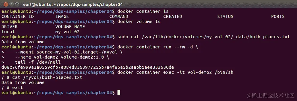 请注意Data from image行。现在,使用一个包含与both-places.txt匹配名称的文件的预先创建的卷,但文件中包含Data from volume内容,我们将基于该图像运行一个容器。发生了什么: