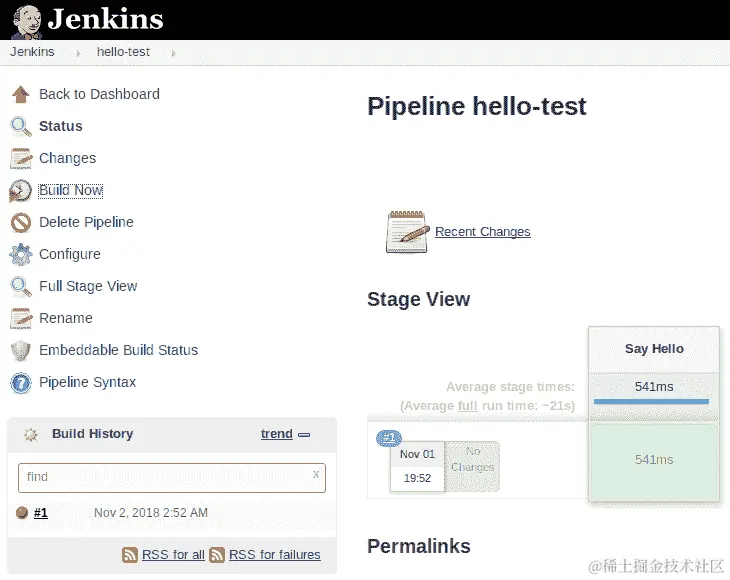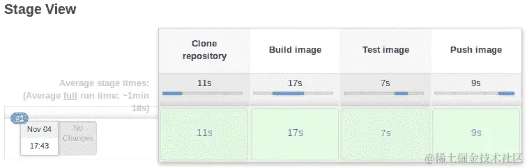 现在,只需等待。在五分钟或更短的时间内,作业的第一个构建将自动启动,因为我们已经设置了每五分钟轮询存储库。当作业完成后,我们将查看控制台日志,但首先让我们看一下作业完成后的 Jenkins 作业视图(当然是成功的):