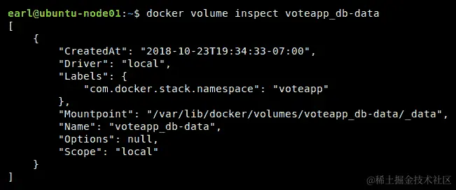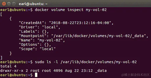 这个卷仍然使用默认的本地驱动程序。使用本地驱动程序只意味着这个卷所代表的文件夹的实际位置可以在 Docker 主机上本地找到。我们可以使用卷检查子命令来查看该文件夹实际上可以找到的位置: