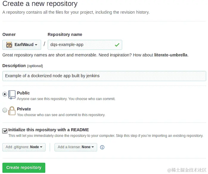 现在,我们的应用程序的初始版本已经创建并推送到我们的 GitHub 仓库,我们准备创建 Jenkins 作业来拉取我们的仓库代码,构建我们的应用程序镜像,对其进行测试,然后发布我们应用程序的 Docker 镜像。首先,通过登录到 Jenkins 服务器并单击“新项目”链接来创建一个新的 Jenkins 作业。接下来,在“输入项目名称”输入框中输入要用于作业的名称。我正在使用dqs-example-app。选择“流水线”作为我们正在创建的作业类型,然后单击“确定”按钮。