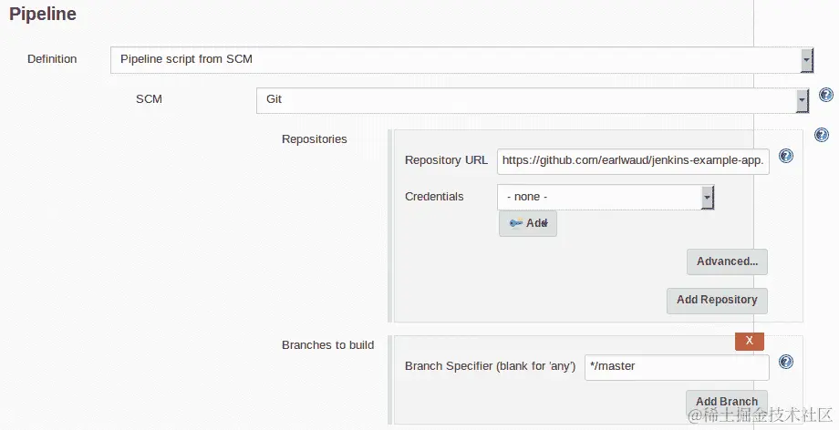 接下来,我们要设置我们的流水线。与以前的示例不同,这次我们将选择“来自 SCM 的管道脚本”选项。我们将为我们的 SCM 选择Git,然后输入 GitHub 上我们应用程序仓库的存储库 URL。对于此示例,该 URL 为https://github.com/EarlWaud/dqs-example-app.git。确保“要构建的分支”值设置为*/master,这是默认值。您的流水线定义应该看起来很像以下内容: