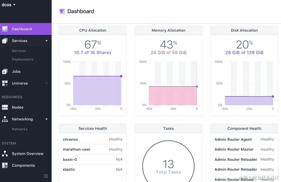 以下截图是 DC/OS 的 Web 控制台界面,汇总了来自每个组件的信息: