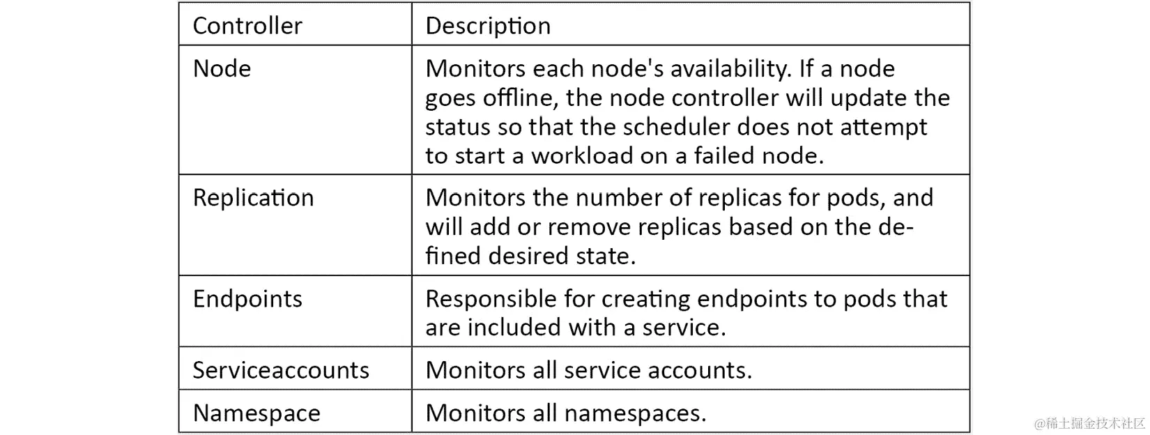 每个控制器为集群提供独特的功能,每个控制器及其功能在此列出:
