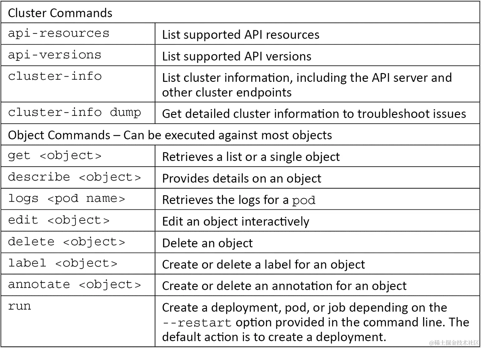 kubectl包括可以提供一般集群信息或对象信息的命令和选项。以下表格包含了命令的速查表以及它们的用途。我们将在未来的章节中使用许多这些命令,因此您将在整本书中看到它们的实际应用: