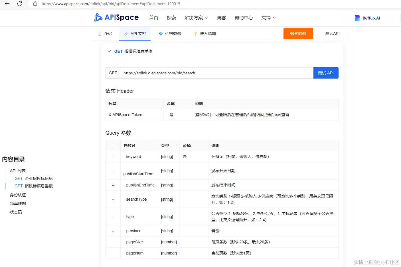 这里我使用的是 APISpace 的 企业招投标信息API,可以通过公司名称/公司ID/注册号或社会统一信用代码获取企业招投标信息;还可以通过关键词方式查询全国或者某些省份的相关招投标信息。招投标信息包括采购人、发布时间、正文信息等字段的详细信息。