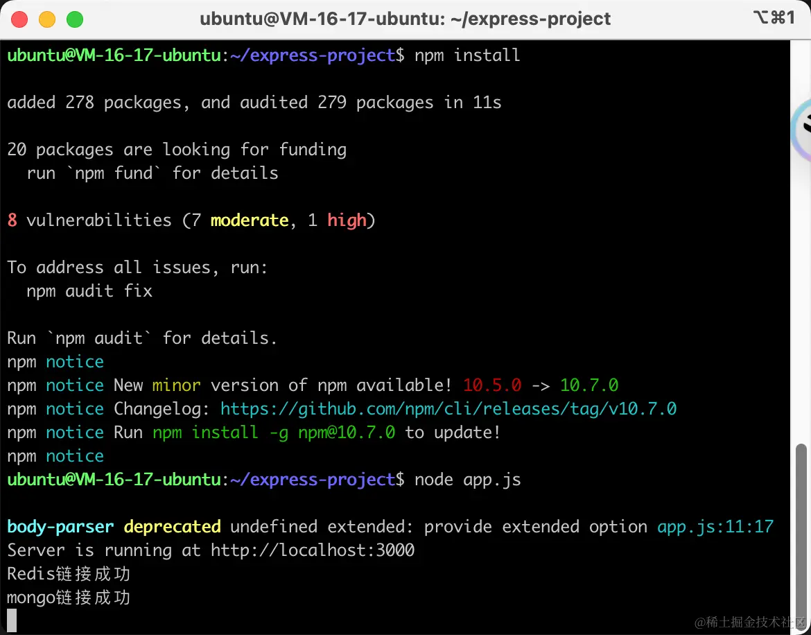 这会启动Node.js服务器,通常我们会在app.js文件中定义服务器的启动逻辑。