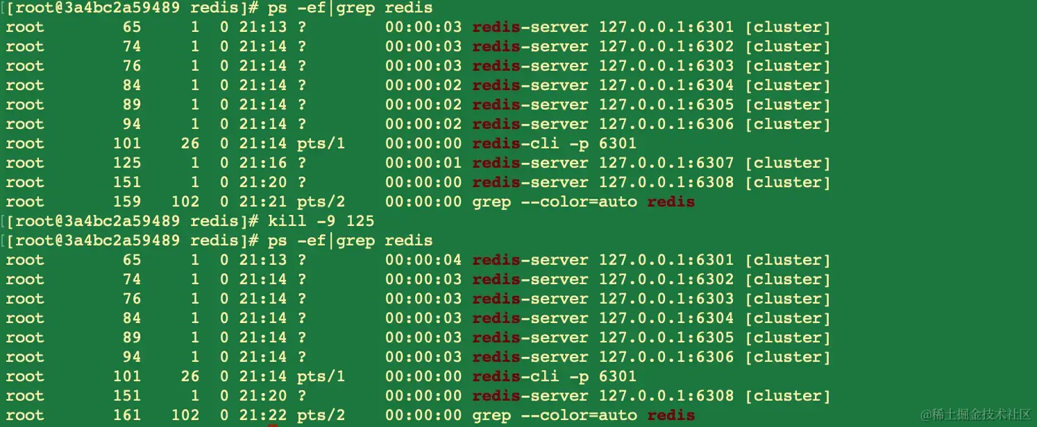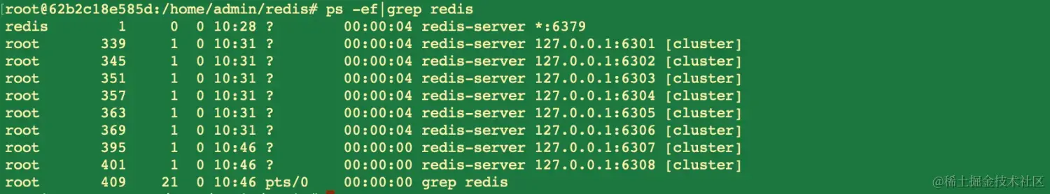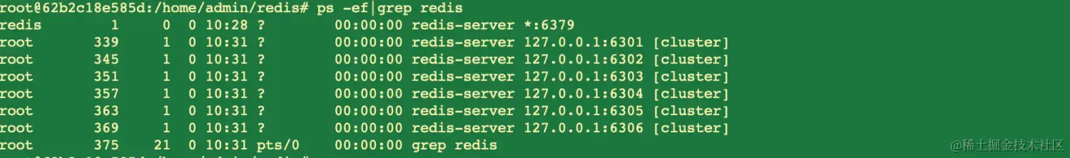 进入 Redis 的 Container 后,执行如下命令来开启多个 redis 实例,由于 Redis Cluster 需要至少3个节点,所以我们开启了6个实例(3节点主+备)。