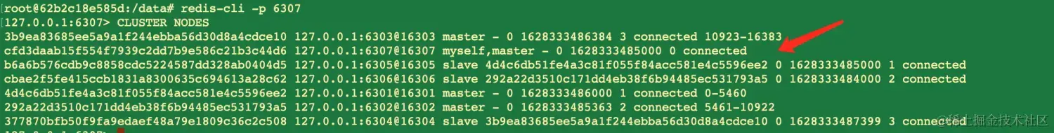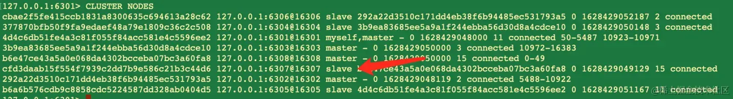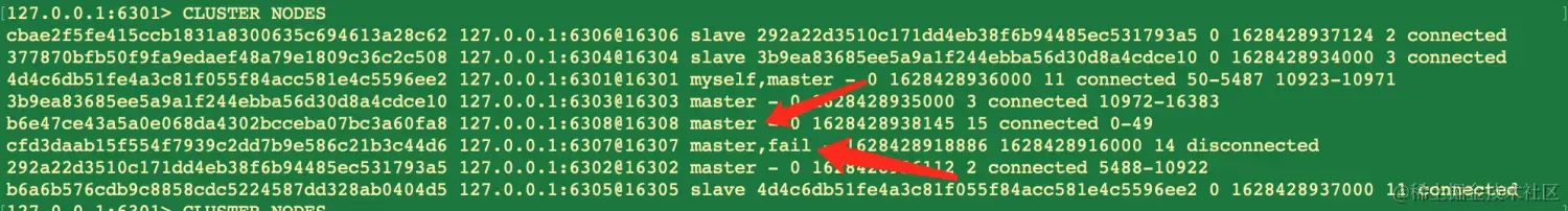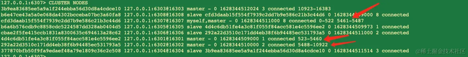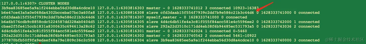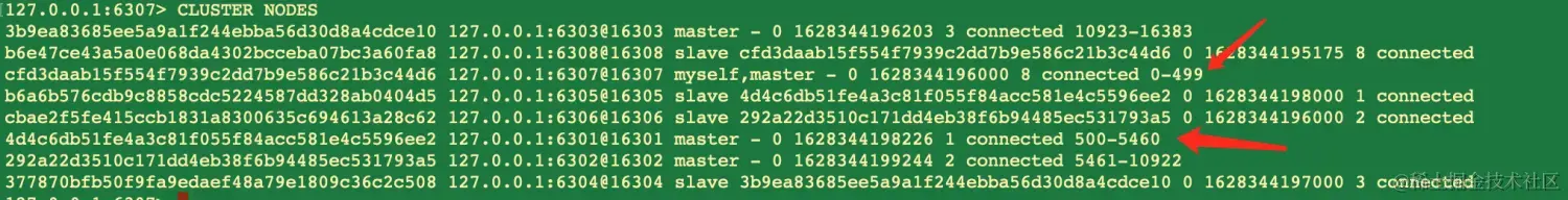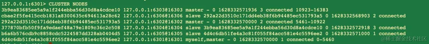 我们再运行 CLUSTER NODES 命令来观察下集群状态。
