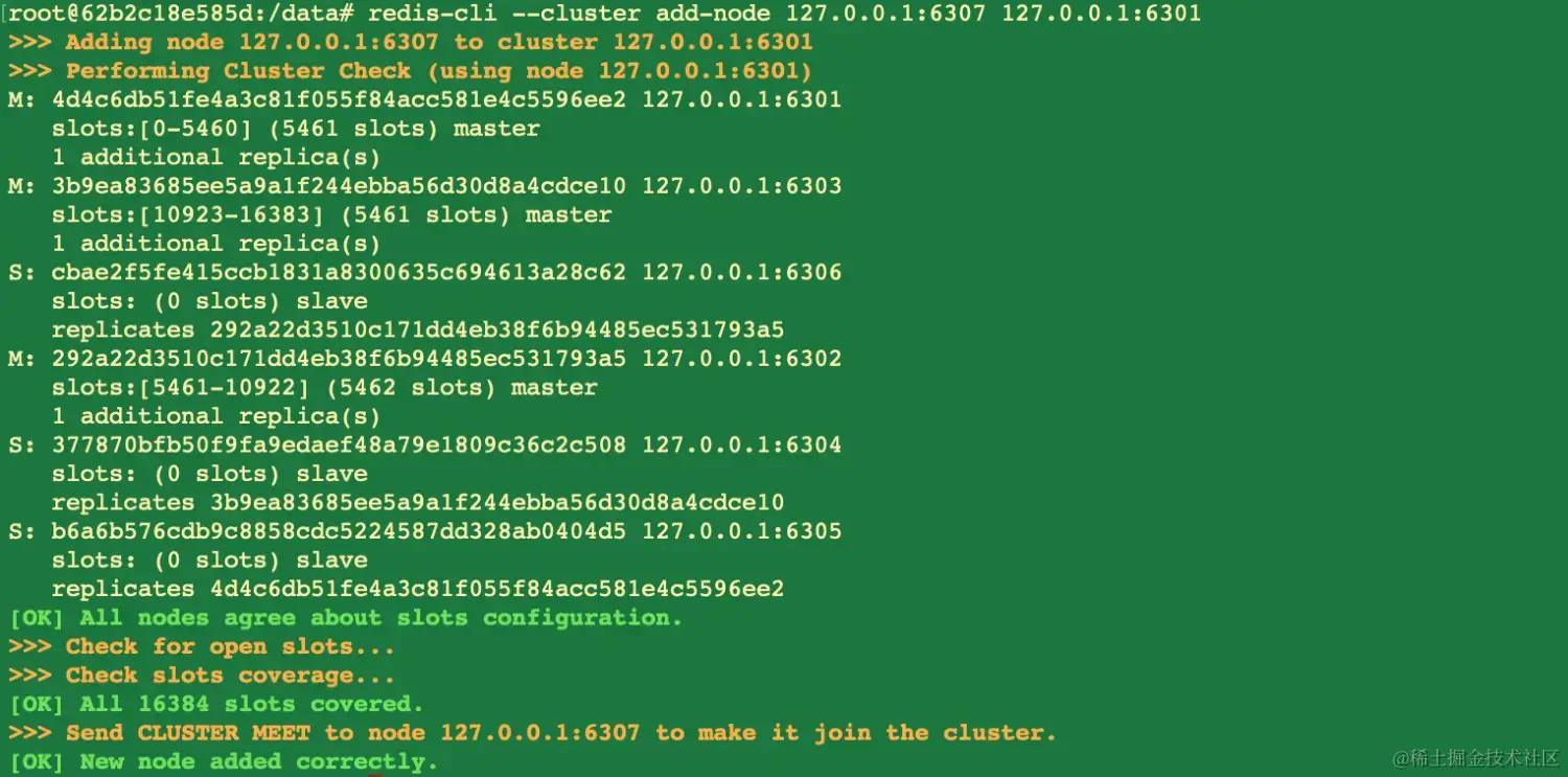 然后我们执行命令“redis-cli --cluster add-node 127.0.0.1:6307 127.0.0.1:6301”,将 6370 节点加入到已有的集群中。