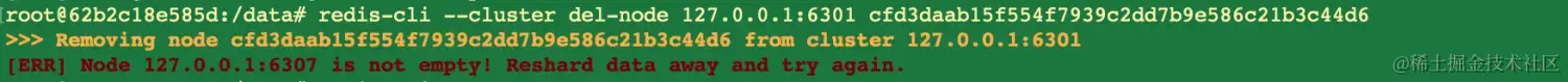 集群缩容使用“del-node”命令,需要缩容的节点上没有 slots 才可以。比如我们执行如下命令“redis-cli --cluster del-node 127.0.0.1:6301 cfd3daab15f554f7939c2dd7b9e586c21b3c44d6”。