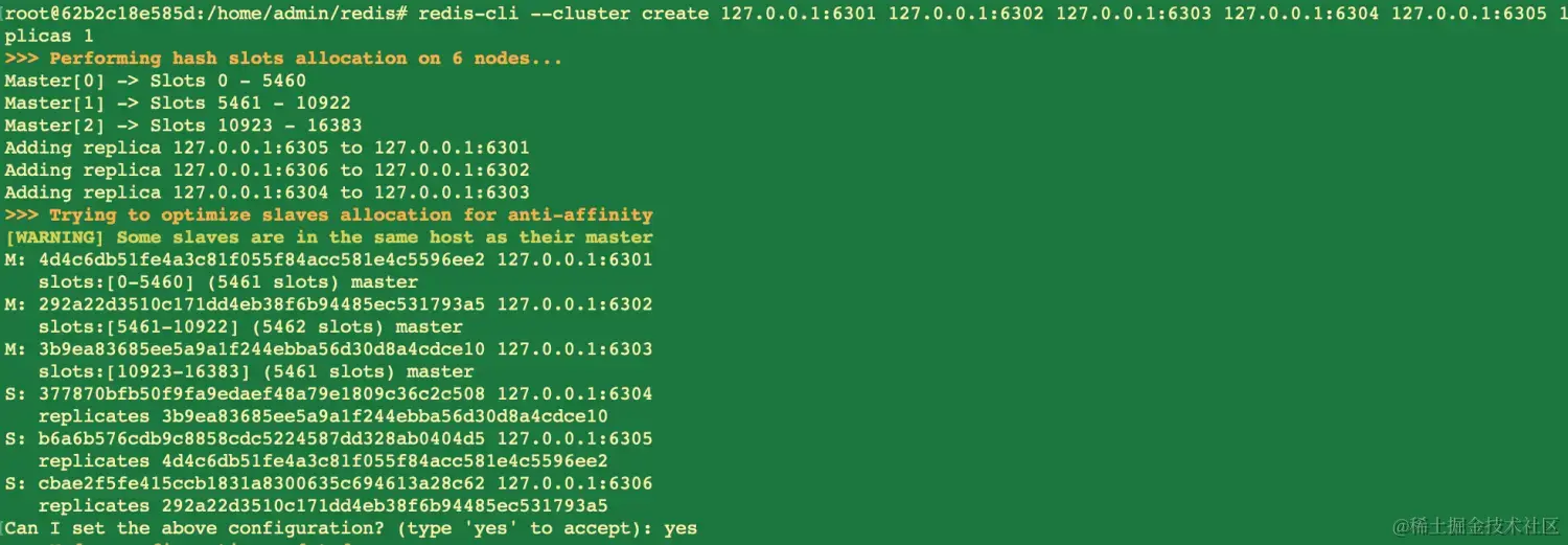 执行命令后可以观察控制台,Redis 会引导我们方便的搭建出集群。为各个节点分好了主/从身份,并且将 slots 槽分散到各个节点。在输入 yes 后将真正搭建 Redis 集群。