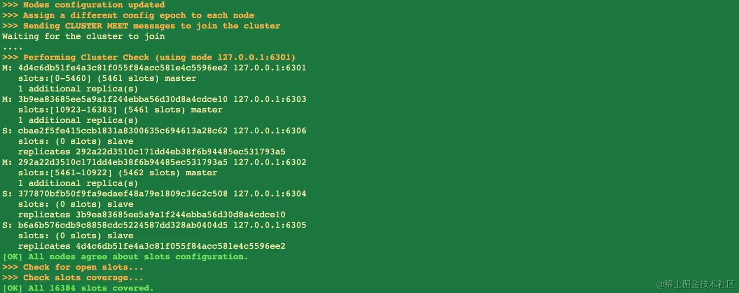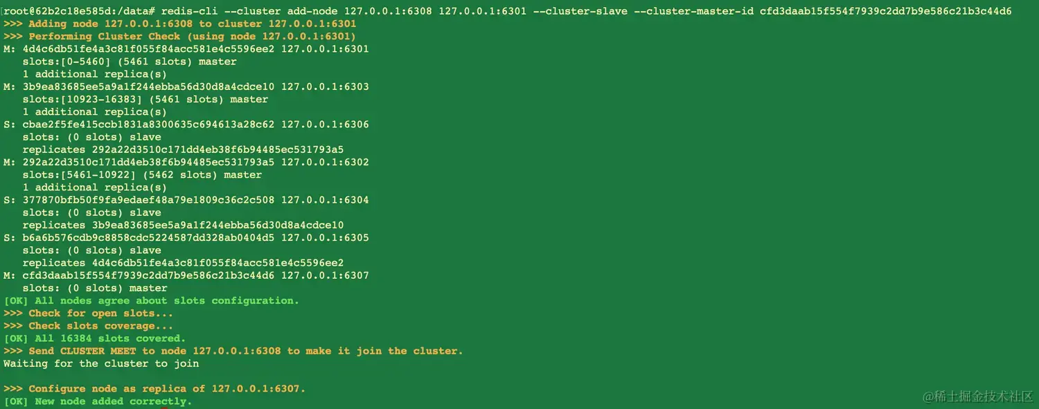可以看到跟添加 6307 节点类似的过程,只不过多了 “Configure node as replica of 127.0.0.1:6307”过程,这个就是为 6307 添加 slave 的指令。