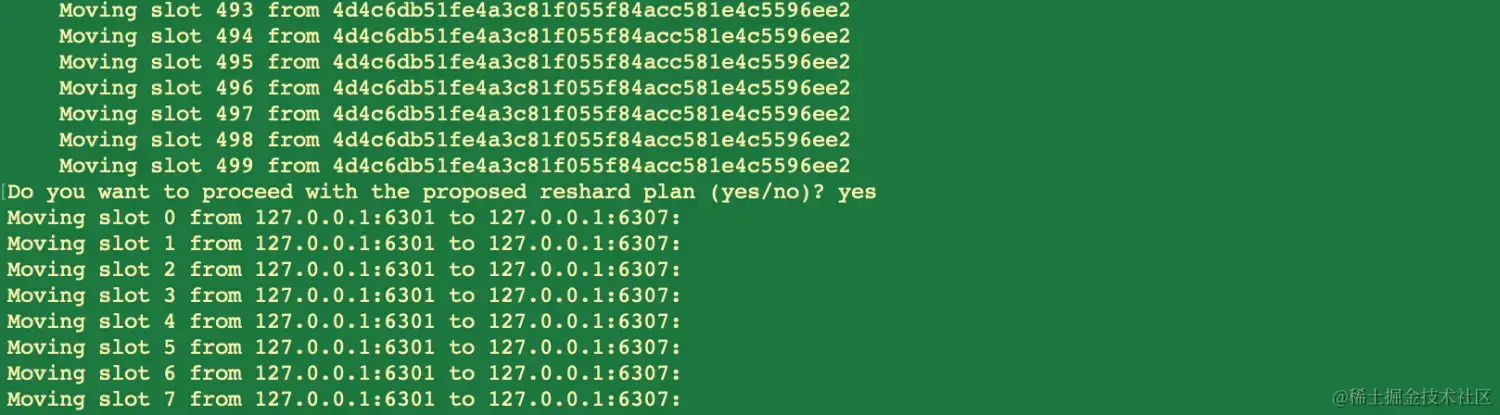 我们执行命令“redis-cli --cluster reshard 127.0.0.1:6301 --cluster-from 4d4c6db51fe4a3c81f055f84acc581e4c5596ee2 --cluster-to cfd3daab15f554f7939c2dd7b9e586c21b3c44d6 --cluster-slots 500”,这个命令也很明了,就是从 6301 节点移动 500 个 slots 到 6307 节点。