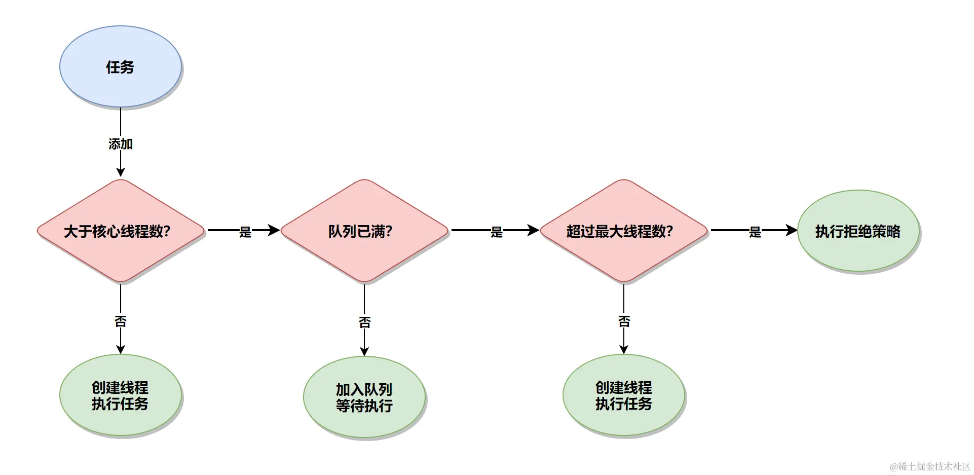 - 判断最大线程数:如果任务队列已满,则判断当前线程数量是否超过最大线程数?如果结果为 false,则新建线程执行此任务。