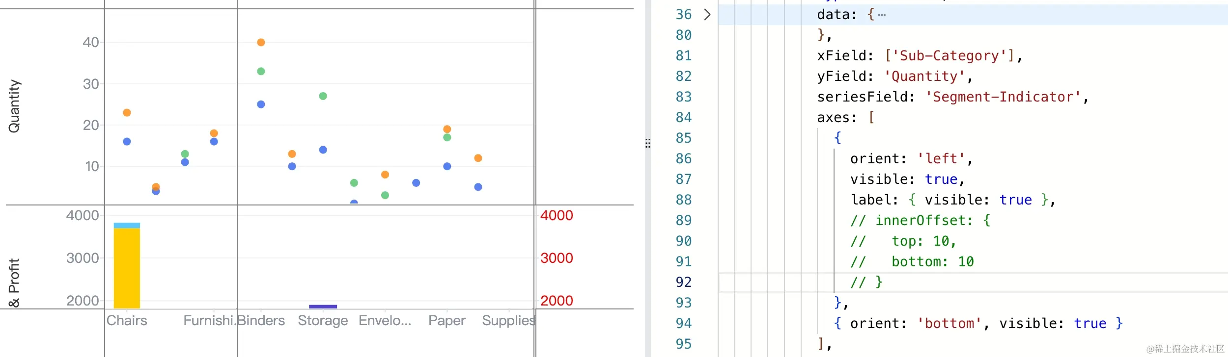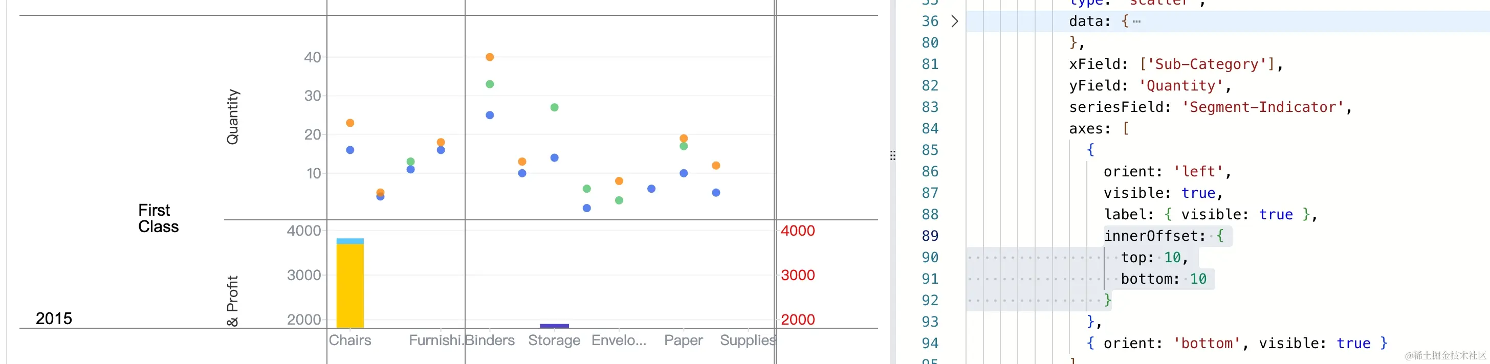 axes轴上配置innerOffset,如上加上之后图表上元素与表格边缘就有一定的间距了。