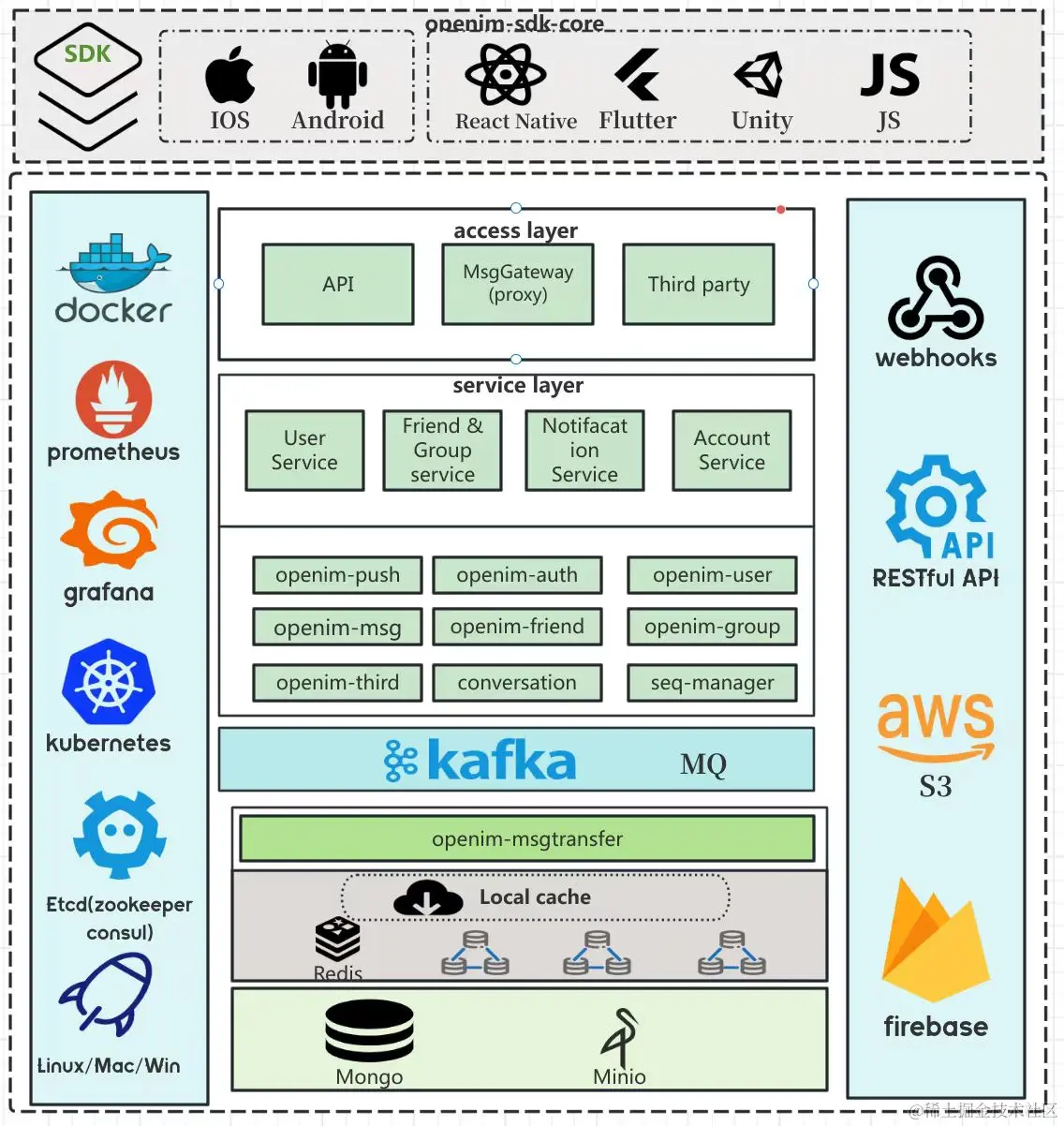 OpenIM主要由OpenIM SDK和OpenIM Server两部分组成,它们为开发者提供了一套工具和服务,使得开发者能够在自己的应用程序中轻松集成即时通讯功能,包括发送和接收消息、用户管理、群组管理等。