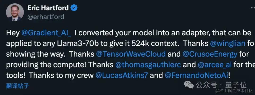 首先1048k上下文版Llama 3微调模型来自Gradient AI,一个企业AI解决方案初创公司。