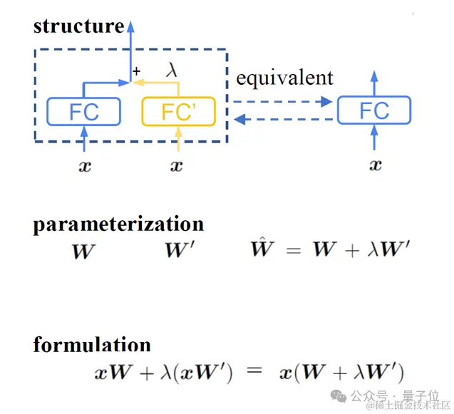 如图所示,比如有不同模态的两个线性层 FC 和 FC’, 那么跨模态结构重参数化就是要通过构建一个运算完全等价的线性层来承载两个模态的运算,在这里直接将来自不同模态的两部分权重 **(W 和 W’)做线性组合(W+λW’)**来平衡两个模态的权重对于目标模态的贡献。