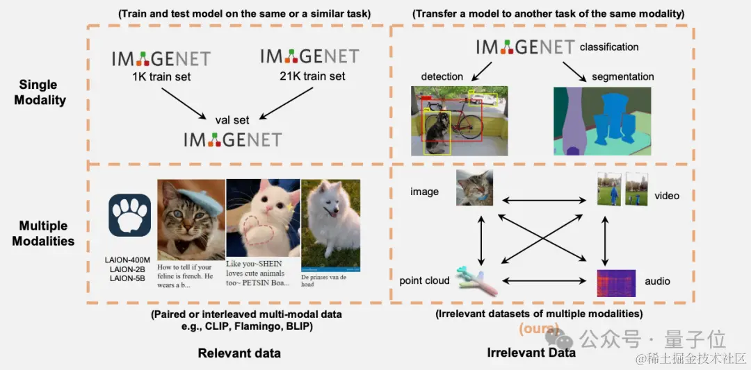 比如训练一个图像分类模型,除了标注好类别的图像数据集,增加视频、音频、点云等模态数据,也能显著提升模型在图像分类上的性能。
