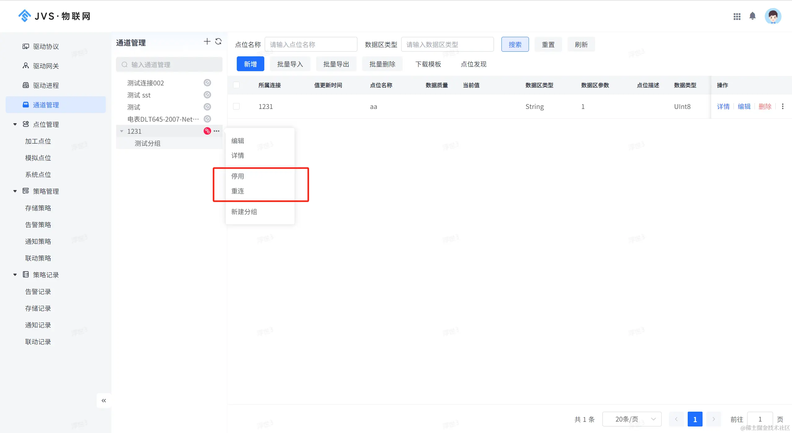 - 用户可以选择手动启停作为设备连接的启停策略。在平台页面,用户通过点击相应按钮(启用、重连、停用)手动进行设备连接的启停控制。