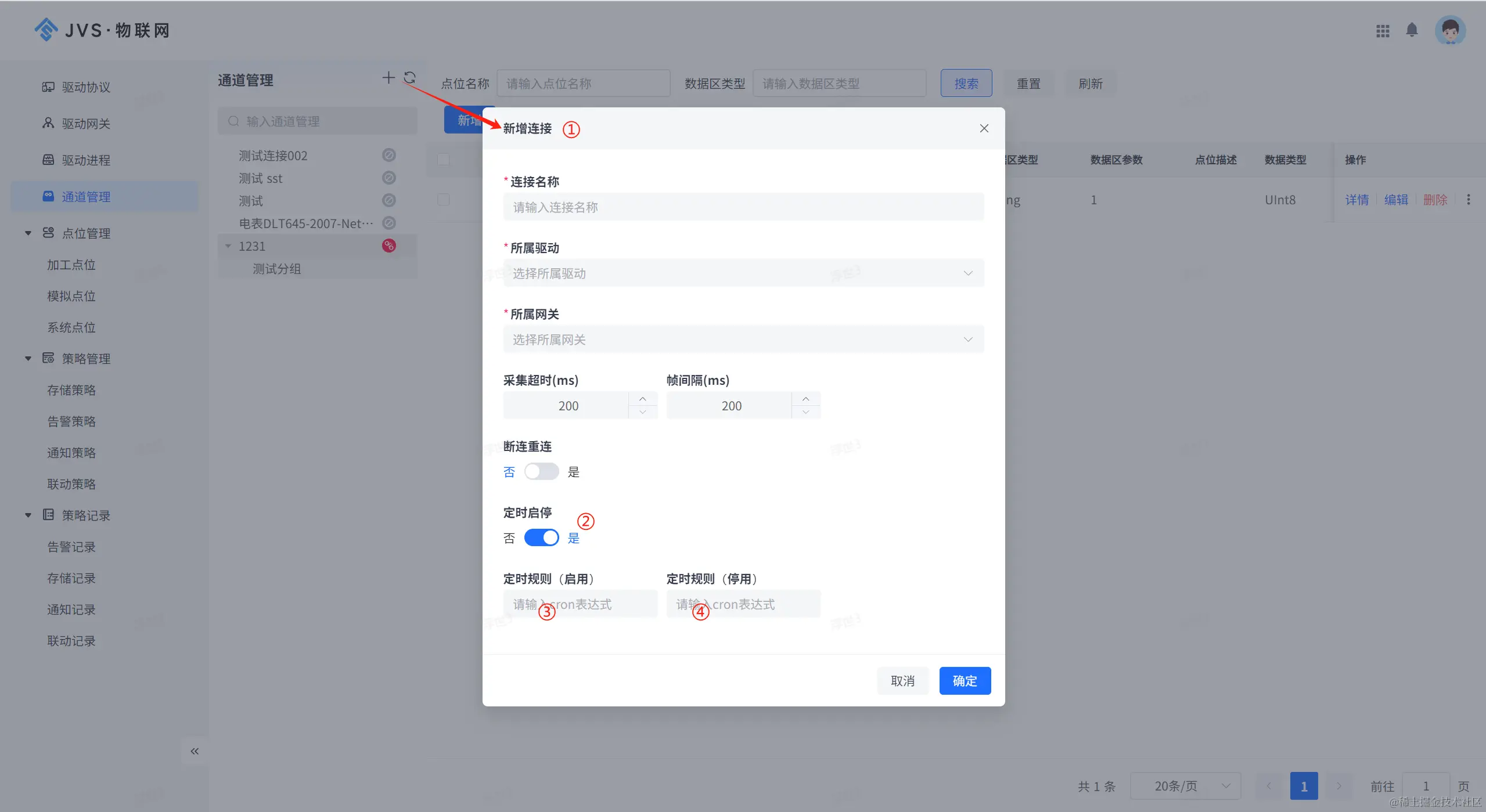 ①:点击通道管理“+”,系统弹出新建通道连接的表单