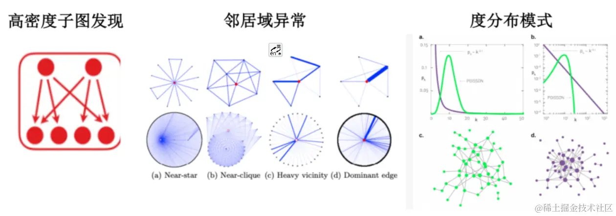 - 高密度子图,一些异常账号和异常行为对象之间会存在高密度子图。