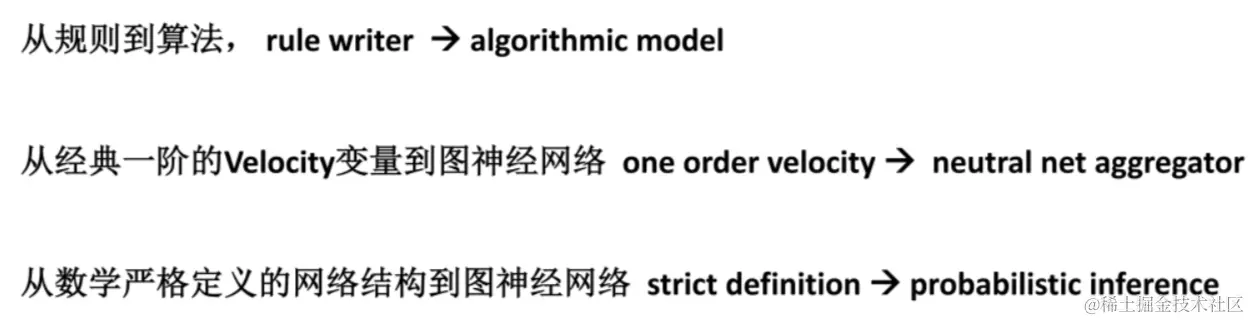早年间风控尤其是风控策略,更多的是一个 Rule Writer。通过业务理解写规则,慢慢演化成算法模型。还有从经典一阶的 Velocity 变量变成了 Neutral Net Aggregator(后面会细讲)。传统的风控算法或规则只能看到相邻点的特征,现在可以通过神经网络计算 Aggregator。这也是从数学严格定义的网络结构到图神经网络、Strict Definition 到概率化的推断的演进过程。