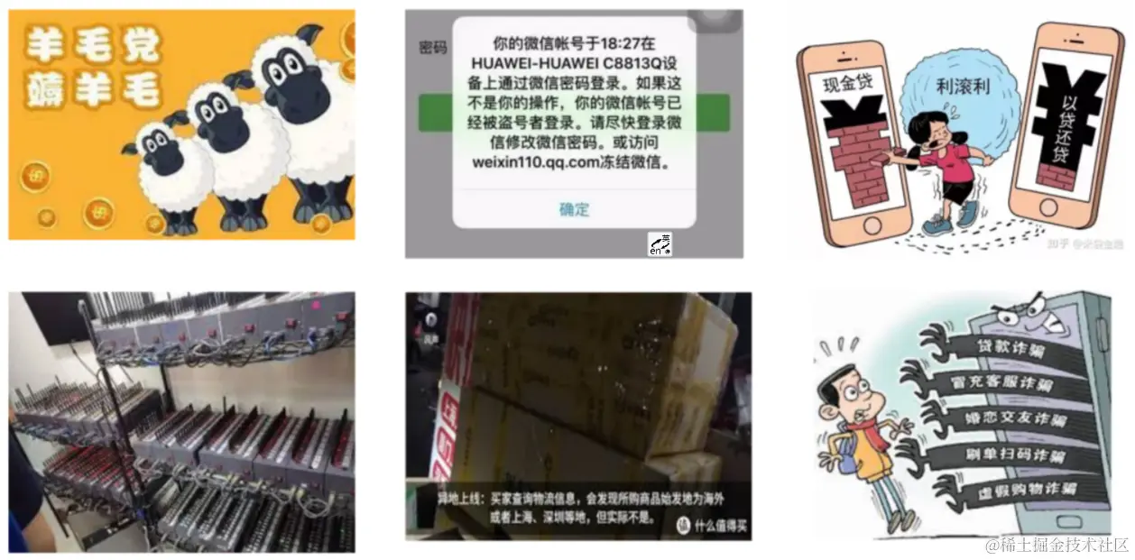 众所周知的羊毛党薅羊毛、账户被盗、盗卡、现金贷、“以贷养贷”、猫池、恶意退货、物流空包、各种各样的诈骗、杀猪盘等等,这些场景都属于互联网风控范畴。