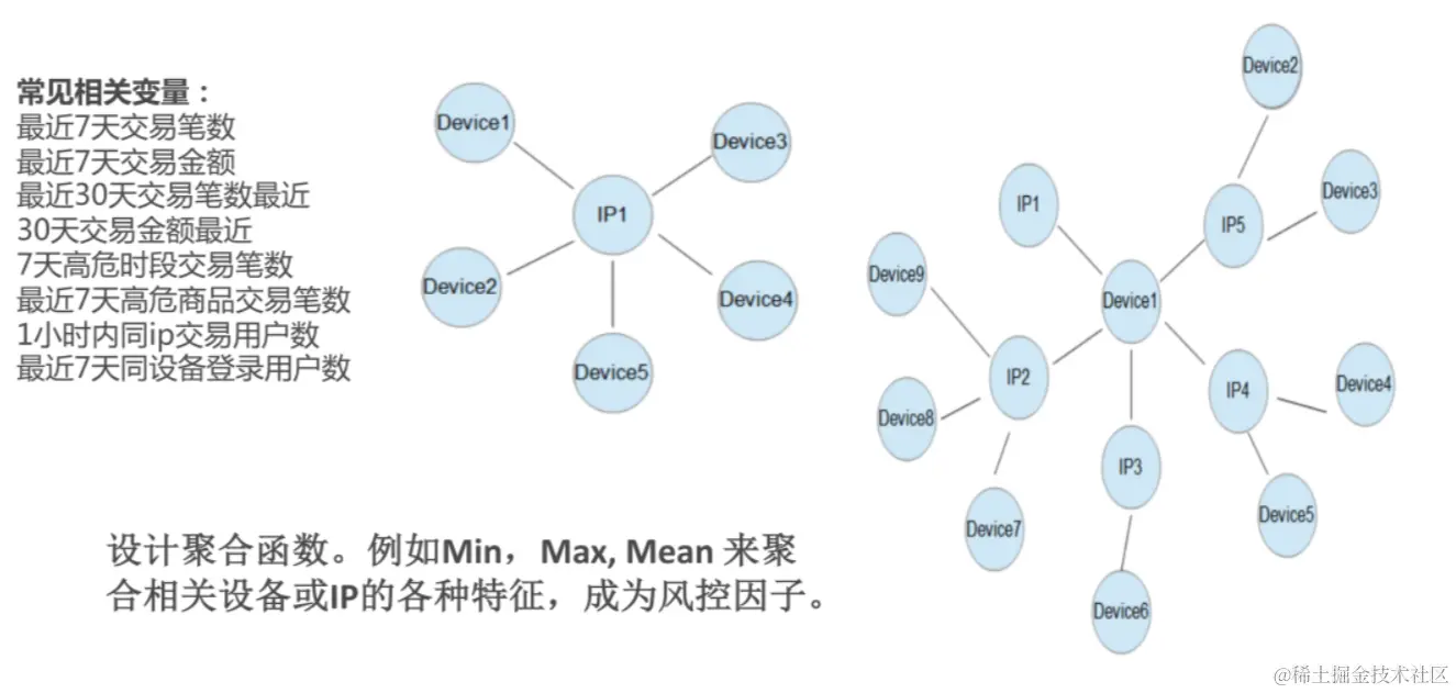 Mean 函数,如周围的设备平均的交易数。之前风控从业者通过手工去设计这个一阶的 Aggregate,通过图算法能从一阶到两阶。