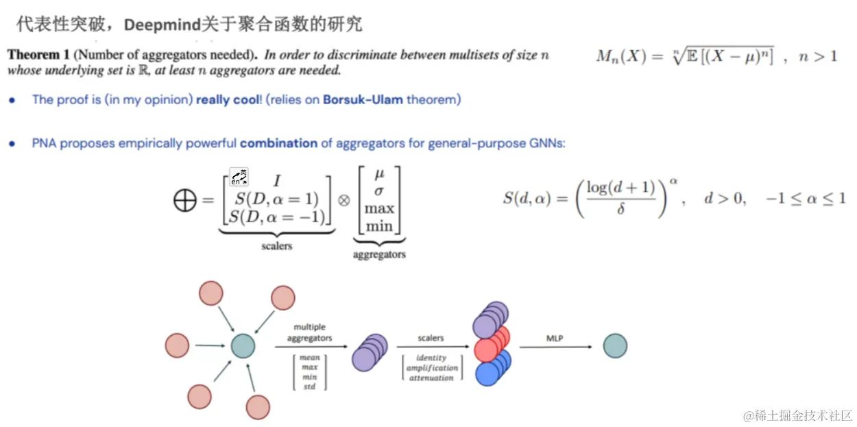 为解决这个问题,Deepmind 设计了一种新型的 Aggregator 算子, N 个 Moments 对应着 N 个 Aggregator 算子。后面加了一个 Scalers, 下面的 Sigma 相当于是整合度的总和。d 就是这个点的度,Alpha 是一个系数,Alpha 有 1 又有 -1。