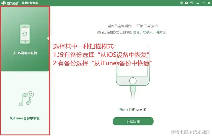 步骤2:通过数据线将手机连接到电脑上,然后选择其中一种您需要的扫描模式,点击**【开始扫描】**按钮。