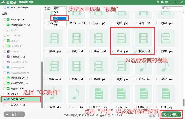 如何找回已删除的qq视频?如果以上方法都无法找回您需要恢复的QQ视频,可以尝试使用专业的数据恢复软件——数据蛙苹果恢复专家。这款软件能够深度扫描手机存储空间,大概率找回已经删除或丢失的视频文件。