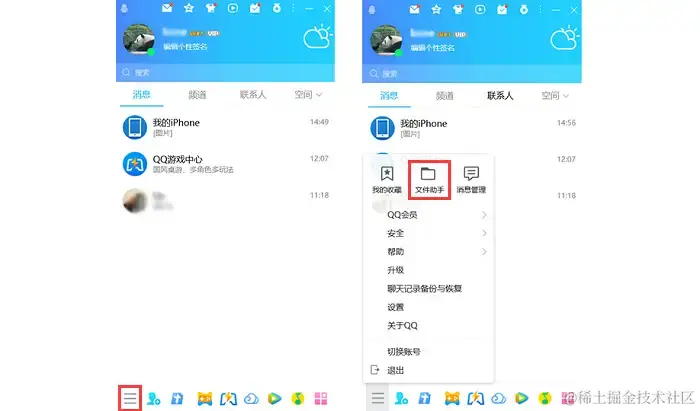 步骤1:在电脑登录QQ,点击**【三】,选择【文件助手】**。
