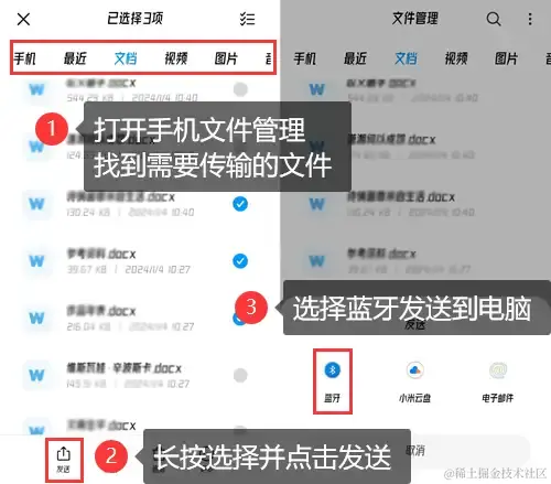 第二步:在手机文件管理中,找到需要上传到电脑的文件,长按可选择多项数据,然后点击 【发送】 ,选择发送方式 【蓝牙】 ,就可以将手机数据传输到电脑。