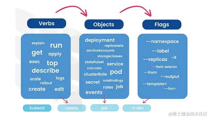 如果 kubectl 是一种语言,那它将是一种kubectl + 动词 + 对象/[名称可选] + 标志 (kvof) 语言