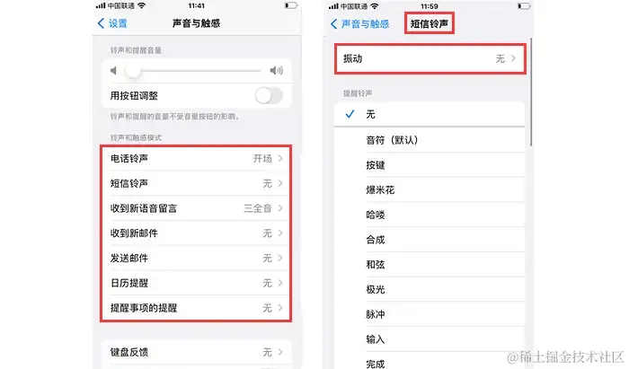 步骤3:在**【铃声和触感模式】下,你可以看到各种系统功能的声音和触感设置,比如【电话铃声、短信铃声、日历提醒】等。iphone消息震动怎么关?找到你想关闭的功能的震动选项,将【振动】设定为【无】**即可。
