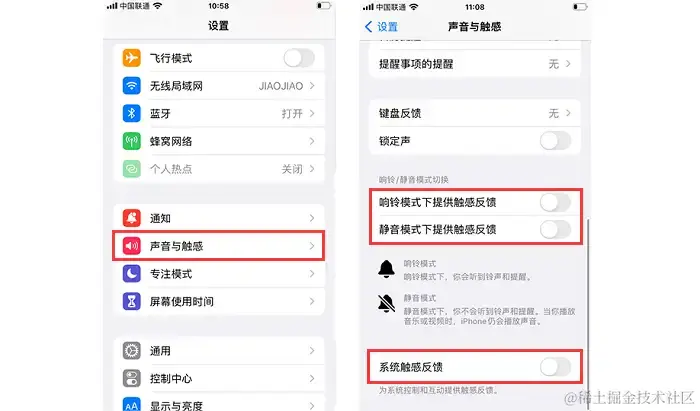 步骤2:在**【声音与触感】设置页面中,你会看到【响铃模式下提供触感反馈】、【静音模式下提供触感反馈】的选项,把它们的【开关按钮】给关闭上。在界面下方,把【系统触感反馈】**也给关闭。